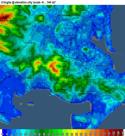 Below is the Elevation map of Cringila, which displays elevation range with different colors. Scale of the first map is from -6 to 144 m (-20 to 472 ft) with average elevation of 23.6 meters (=77 ft) [note 1]