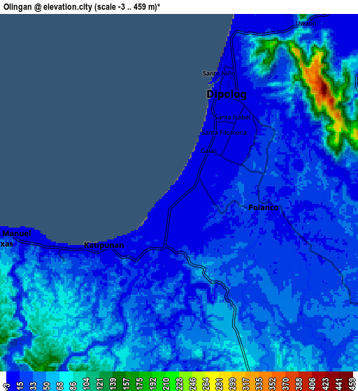 Olingan (Zamboanga Peninsula, Province of Zamboanga del Norte), Philippines elevation is 10 meters and Olingan elevation in feet is 33 ft above sea level [src 1]. Olingan is a populated place (feature code) with elevation that is 78 meters (256 ft) smaller than average city elevation in Philippines.