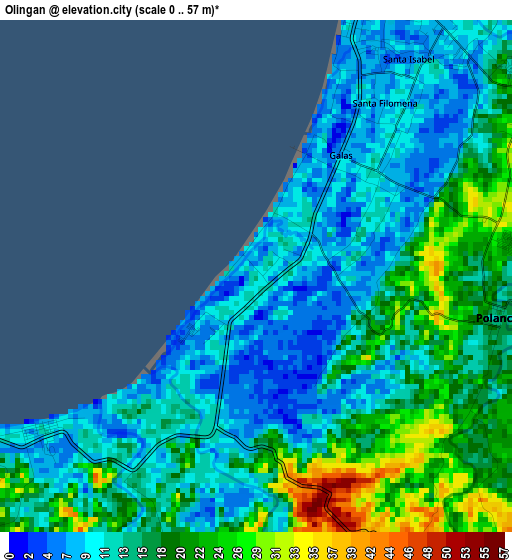 Below is the Elevation map of Olingan, which displays elevation range with different colors. Scale of the first map is from 0 to 57 m (0 to 187 ft) with average elevation of 14.9 meters (=49 ft) [note 1]