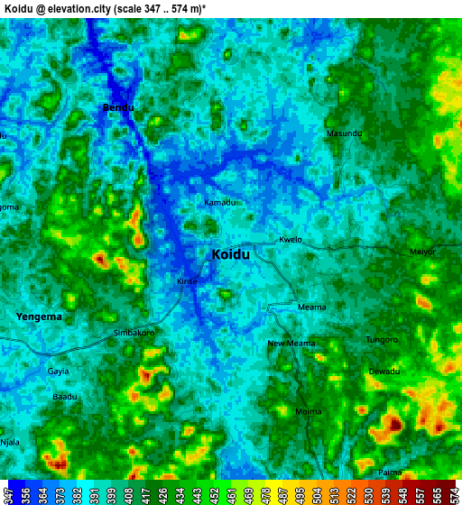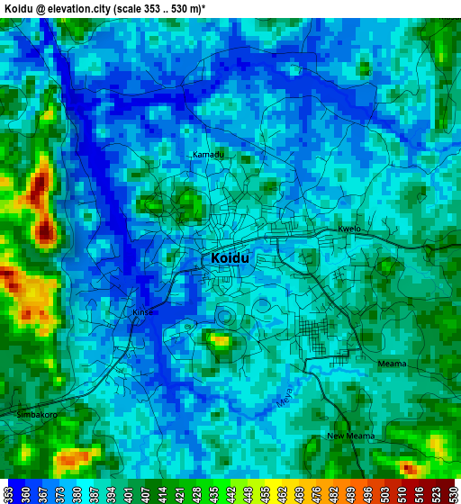 Below is the Elevation map of Koidu, which displays elevation range with different colors. Scale of the first map is from 353 to 530 m (1158 to 1739 ft) with average elevation of 390.1 meters (=1280 ft) [note 1]